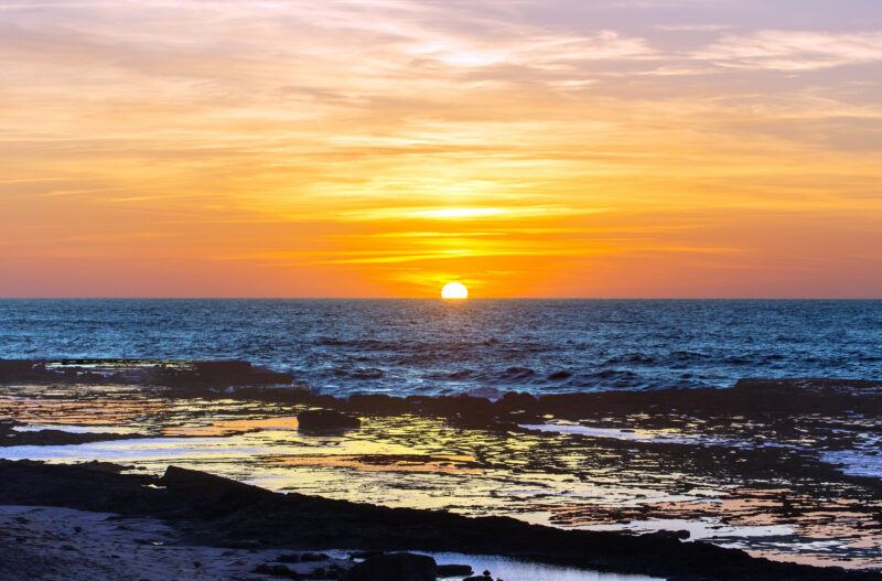Water temperatures range from 16–22°C. Winter requires a 3/2 or 4/3 wetsuit, while summer is fine in a springsuit or even boardshorts on hot days. Air temps average 18–24°C in winter and 25–35°C in summer, with long sunny days common year-round.